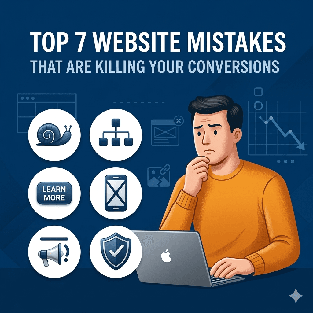 Check: <2% conversion rate, no pricing, generic testimonials, buried CTAs. All need immediate fixes.