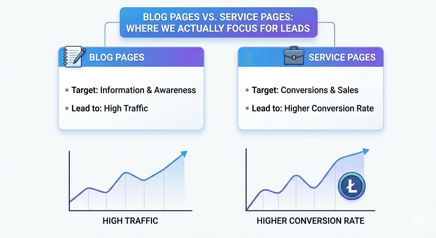 When business owners ask "Blog Pages vs Service Pages: Where We Actually Focus for Leads," the answer from our agency audits is clear: service pages generate 4-7x more qualified leads than blogs for small businesses and service providers. In 2026, with AI search dominating and zero-click results taking 60%+ of traffic, money pages (service offerings) must be engineered for conversions while blogs build the authority foundation.