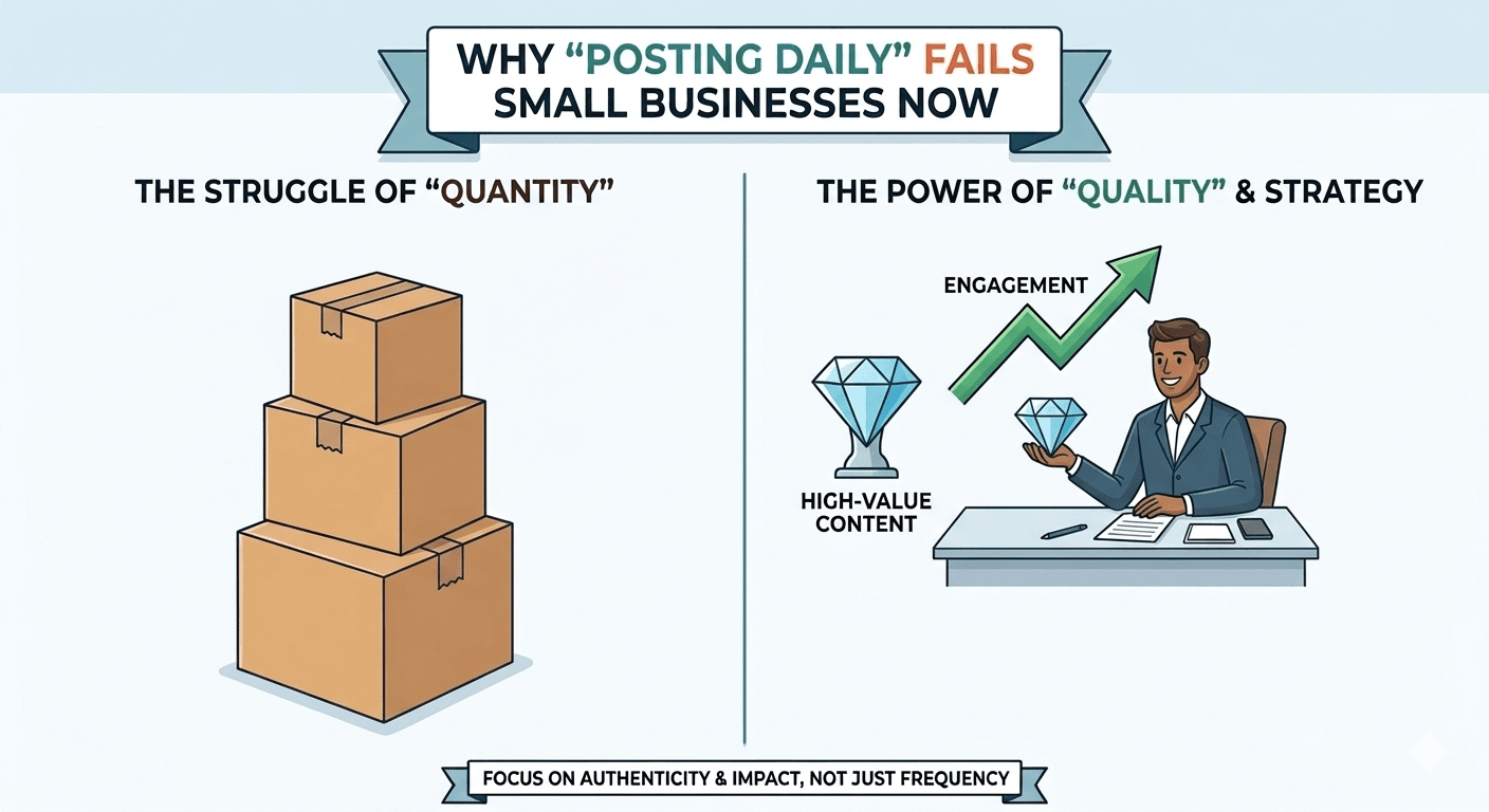 Daily posting has become the default advice for small businesses, real estate agents, coaches, and service providers chasing digital marketing success in 2026. "Post every day or get left behind" echoes across social media courses and agency pitches.