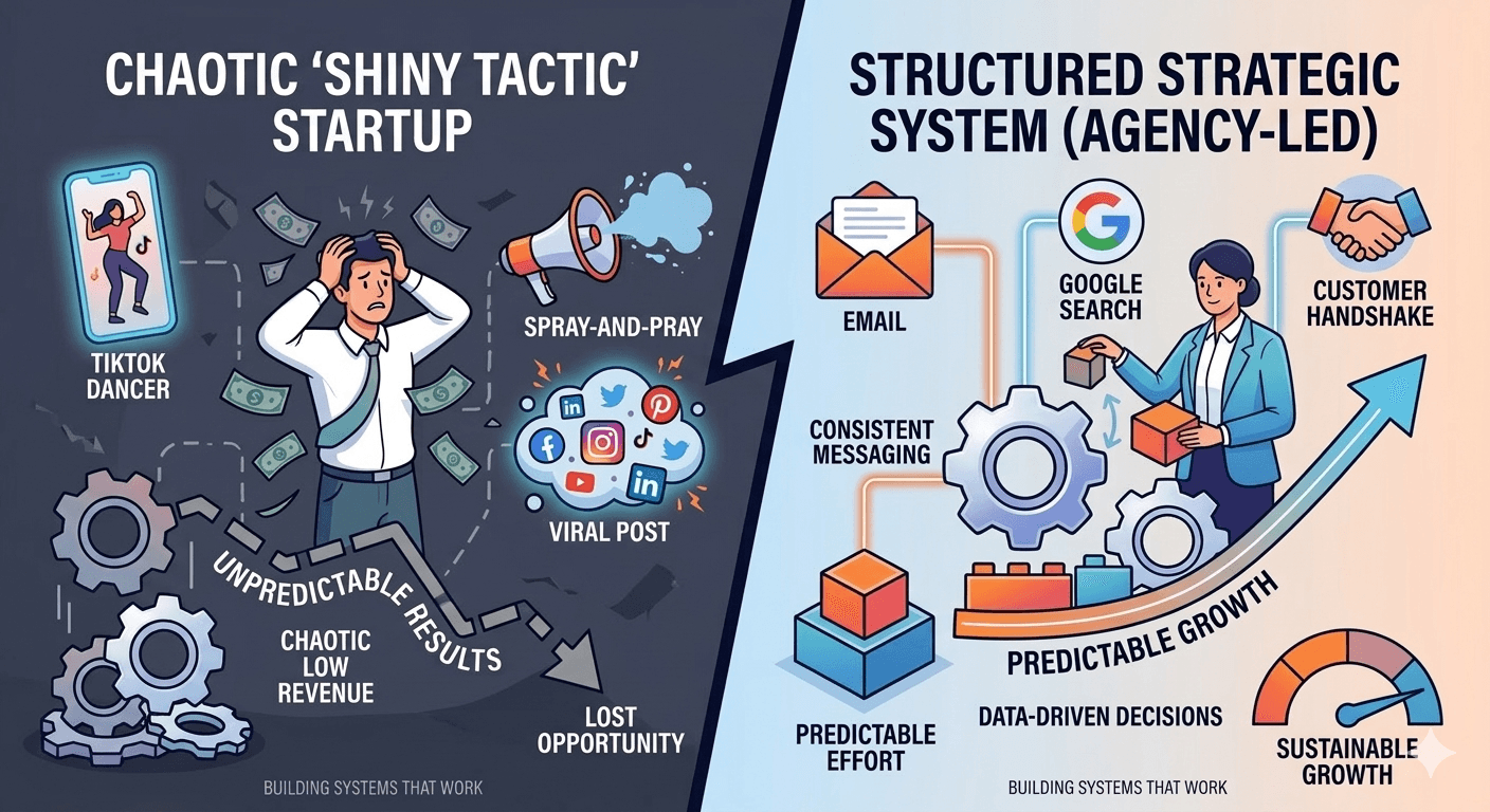 New businesses fail at marketing because they chase shiny tactics instead of building systems that work. In our first year working with startups, we saw 70% make the same predictable mistakes: inconsistent posting, spray-and-pray ads, and ignoring their best customers. These errors cost them 40-60% of potential revenue in months when every dollar counts.